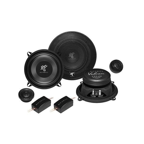 Hifonics VX5.2E sistema di altoparlanti composto da coppia di woofer 130 mm, coppia di tweeter 25 mm, crossover in linea e griglie altoparlanti.